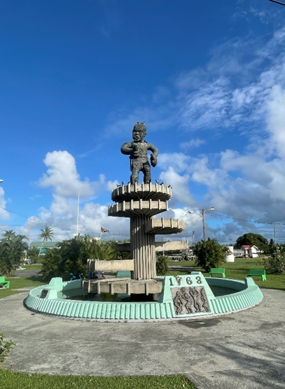 Vom Seawall laufen wir über die Water Street am Umana Yana (indigenes Rundhaus) vorbei und dem I love Guyana Schriftzug sowie der neu aufgestellten Schildkröten Skulptur weiter. Die Skulptur weist auf das Gebiet am Shell Beach ganz im Nordwesten des Landes hin, an dessen Abschnitt jährlich im Frühjahr hunderte seltene Lederschildkröten zur Eiablage kommen. Ein Gebiet, daß unter Naturschutz steht und ausschließlich nur mit Genehmigung und Führer betreten werden kann/darf.